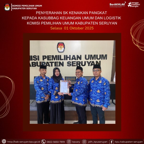 Seruyan, 1 Oktober 2025 – Komisi Pemilihan Umum (KPU) Kabupaten Seruyan menyerahkan Surat Keputusan (SK) Kenaikan Pangkat kepada Kasubbag Keuangan, Umum, dan Logistik, Rieko Putra P. Penyerahan dilakukan secara langsung oleh Sekretaris KPU Kabupaten Seruyan, Neneng Yulia, S.E., bertempat di Ruang Rapat lantai II KPU Kabupaten Seruyan.
