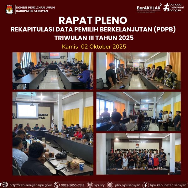 Seruyan, 2 Oktober 2025 – Komisi Pemilihan Umum (KPU) Kabupaten Seruyan menggelar rapat pleno Pemutakhiran Data Pemilih Berkelanjutan (PDPB) Triwulan III Tahun 2025. Acara berlangsung di Ruang Rapat lantai II Kantor KPU Seruyan mulai pukul 09.00 WIB dan dihadiri seluruh komisioner, sekretaris, kasubbag, serta Forkopimda, Bawaslu, instansi terkait, dan perwakilan partai politik.