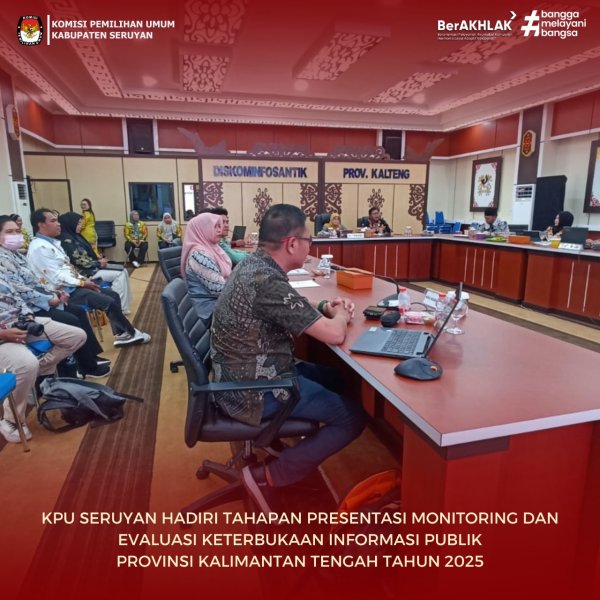 Ketua KPU Kabupaten Seruyan, Muhammad Abdiannoor didampingi oleh Kasubag Divisi Perencanaan, Data, dan Informasi, Slamet Eko Susanto, menghadiri Tahapan Presentasi Monitoring dan Evaluasi (Monev) Keterbukaan Informasi Publik Tahun 2025 yang diselenggarakan oleh Komisi Informasi Provinsi Kalimantan Tengah di Aula Kandareng Tingang, Diskominfosantik Provinsi Kalimantan Tengah, Palangka Raya.