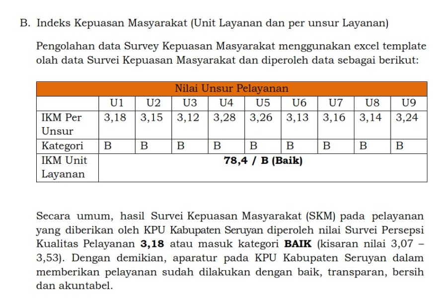 Secara keseluruhan, IKM Unit Layanan KPU Kabupaten Seruyan tahun 2025 adalah 78,4 atau termasuk kategori B (Baik).