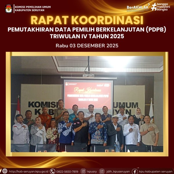 Kuala Pembuang — Komisi Pemilihan Umum (KPU) Kabupaten Seruyan melaksanakan Rapat Koordinasi Pemutakhiran Data Pemilih Berkelanjutan (PDPB) Triwulan IV Tahun 2025 bertempat di Ruang Rapat KPU Kabupaten Seruyan, Rabu (03/12/2025). Kegiatan ini dilaksanakan sebagai persiapan menjelang Rapat Pleno Penetapan PDPB Triwulan IV yang dijadwalkan pada 6 Desember 2025.