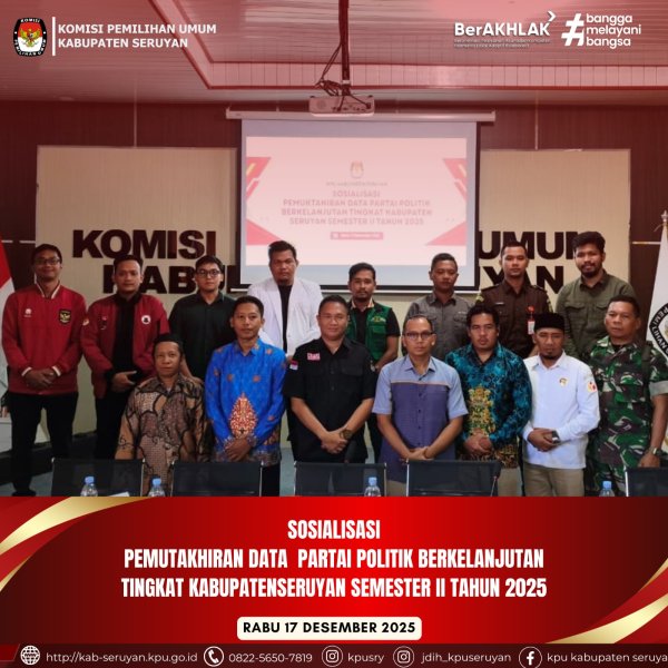 Kuala Pembuang — Komisi Pemilihan Umum (KPU) Kabupaten Seruyan melaksanakan Sosialisasi Pemutakhiran Data Partai Politik Berkelanjutan Tingkat Kabupaten Seruyan Semester II Tahun 2025, pada Rabu, 17 Desember 2025, bertempat di Ruang Rapat KPU Kabupaten Seruyan.