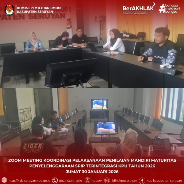 Kuala Pembuang, Komisi Pemilihan Umum (KPU) Kabupaten Seruyan mengikuti kegiatan koordinasi pelaksanaan penilaian mandiri maturitas penyelenggaraan Sistem Pengendalian Intern Pemerintah (SPIP) Terintegrasi KPU Tahun 2026. Kegiatan ini dilaksanakan pada Jumat, 30 Januari 2026, mulai pukul 08.00 WIB.