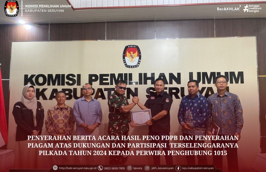 Kuala Pembuang, 2 Juli 2025 — Komisi Pemilihan Umum (KPU) Kabupaten Seruyan menyerahkan Piagam Penghargaan kepada Perwira Penghubung Kodim 1015 Sampit atas dukungan dan partisipasi dalam mendukung kelancaran Penyelenggaraan Pemilihan Kepala Daerah (Pilkada) Tahun 2024 di Kabupaten Seruyan.