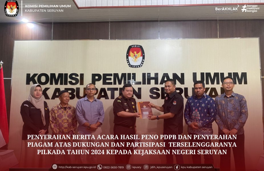 Piagam tersebut diserahkan secara langsung oleh Ketua KPU Kabupaten Seruyan, Muhammad Abdiannoor, didampingi oleh seluruh komisioner: Ali Pandi, M. Tajudinoor, Taopik Hidayat, dan Yulius Setiawan, serta Sekretaris KPU, Neneng Yulia, SE, bertempat di Aula KPU Kabupaten Seruyan.