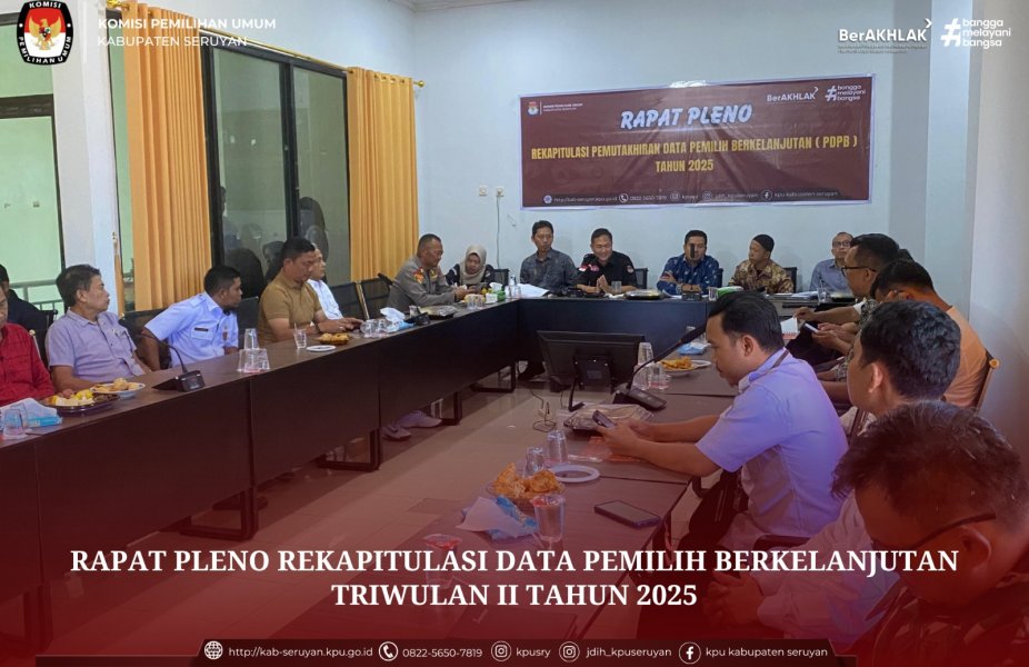 Kuala Pembuang, 2 Juli 2025 — Komisi Pemilihan Umum (KPU) Kabupaten Seruyan menyelenggarakan Rapat Pleno Rekapitulasi Pemutakhiran Data Pemilih Berkelanjutan (PDPB) Triwulan II Tahun 2025 di Kantor KPU Kabupaten Seruyan. Kegiatan ini merupakan bagian dari upaya berkelanjutan dalam memastikan keakuratan data pemilih di Kabupaten Seruyan.