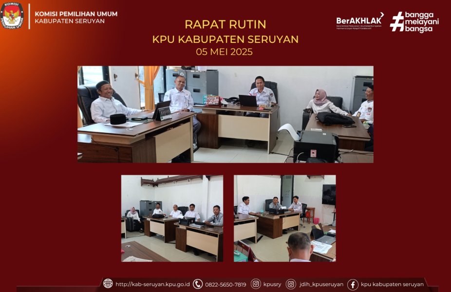 Kuala Pembuang, 5 Mei 2025 — Komisi Pemilihan Umum (KPU) Kabupaten Seruyan menyelenggarakan rapat rutin sebagai bagian dari upaya penguatan layanan informasi publik dan peningkatan koordinasi internal. Rapat tersebut dipimpin oleh Ketua KPU Kabupaten Seruyan, Muhammad Abdianoor, dan diikuti oleh jajaran sekretariat serta pejabat yang tergabung dalam struktur Pejabat Pengelola Informasi dan Dokumentasi (PPID).