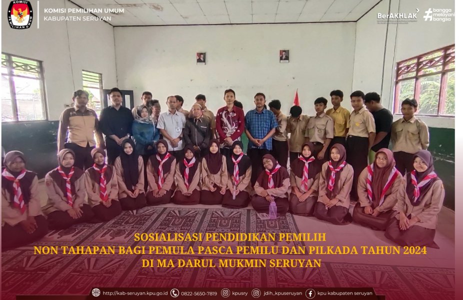 Seruyan, 2 Agustus 2025 — Komisi Pemilihan Umum (KPU) Kabupaten Seruyan kembali turun ke sekolah dalam rangka menanamkan nilai demokrasi sejak dini. Bertempat di MA Darul Mukmin Seruyan, KPU menggelar kegiatan Sosialisasi Pendidikan Pemilih Non Tahapan yang ditujukan khusus bagi para pemilih pemula.