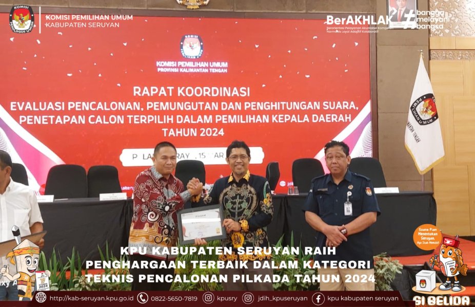 KPU Kabupaten Seruyan mendapatkan penghargaan sebagai yang terbaik dalam Manajemen Teknis Pencalonan Pilkada 2024. Prestasi ini merupakan bukti komitmen KPU Seruyan dalam menjalankan tugasnya secara profesional dan transparan.