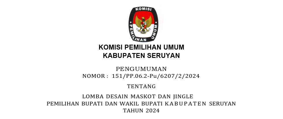 Berdasarkan Peraturan Komisi Pemilihan Umum Republik Indonesia Nomor 2 tanggal 26 Januari 2024 tentang Tahapan dan Jadwal Pemilihan Gubenur dan Wakil Gubernur, Bupati dan Wakil Bupati serta Walikota dan Wakil Walikota Tahun 2024, dengan ini Komisi Pemilihan Umum Kabupaten Seruyan akan melaksanakan Lomba Desain Maskot dan Jingle Pemilihan Bupati dan Wakil Bupati Kabupaten Seruyan Tahun 2024 dengan ketentuan sebagai berikut: