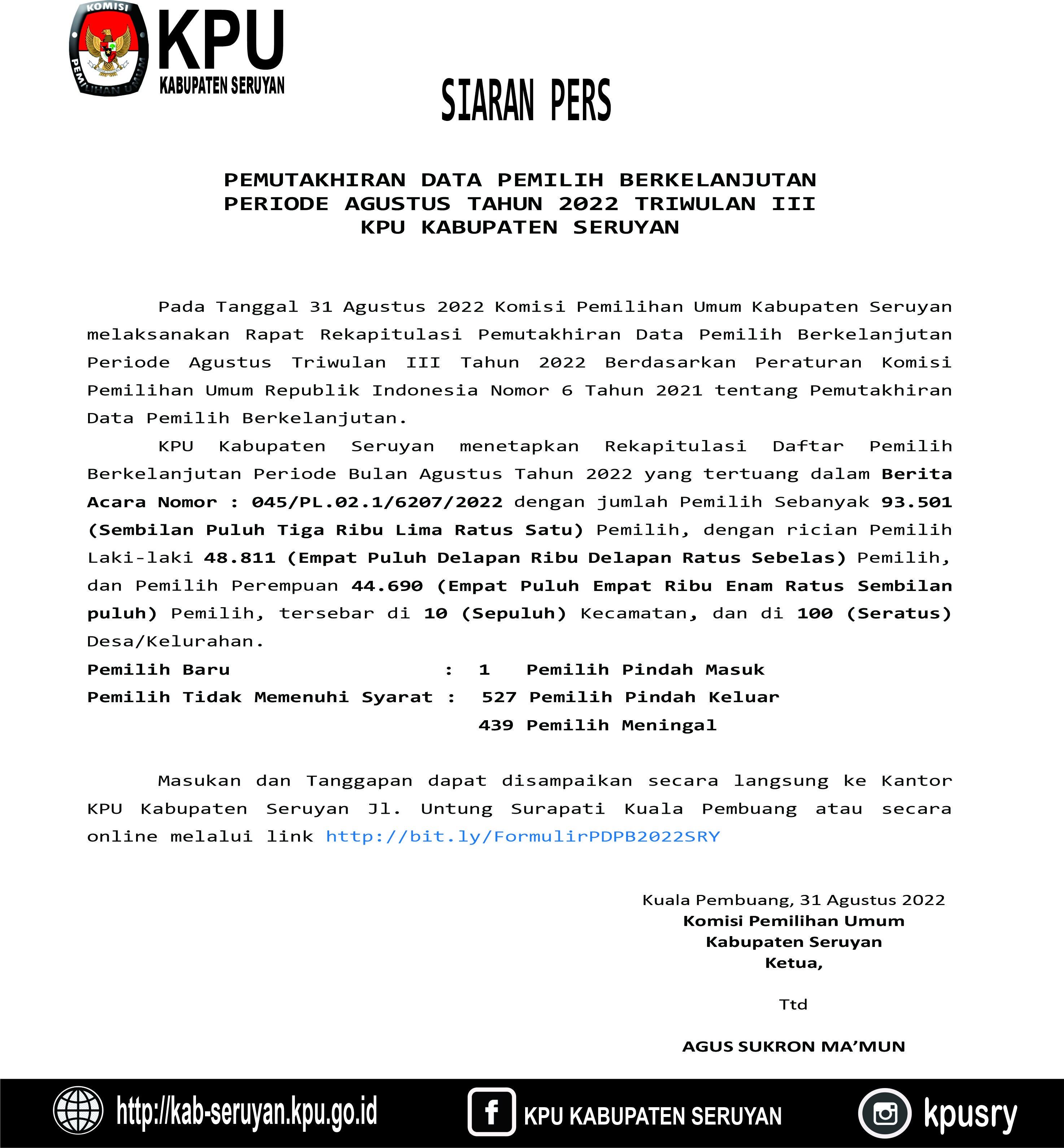 KPU Kabupaten Seruyan menerima masukan dan tanggapan terhadap PDPB yang telah dilaksanakan oleh KPU Kabupaten Seruyan, baik yang belum terdaftar, pidah, data meninggal serta bisa disampaikan ke KPU Kabupaten Seruyan atau melalui link berikut ini: