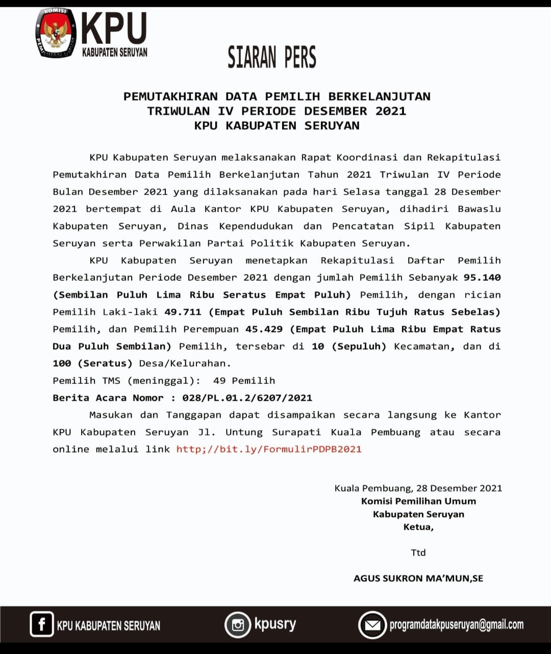 KPU Kabupaten Seruyan mengumumkan Update Daftar Pemilih Berkelanjutan Periode Desember 2021 (Triwulan IV). Apabila ada masukan atau tanggapan dari masyarakat dapat di sampaikan langsung ke kantor KPU Kabupaten Seruyan dengan Alamat Jl. Untung Suropati Kuala Pembuang atau secara online melalui link dibawah ini :