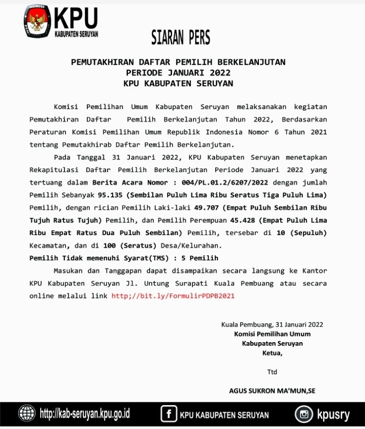 Pada Tanggal 31 Januari 2022 KPU Kabupaten Seruyan melaksanakan Rapat Pleno Rekapitulasi Pemutakhiran Daftar Pemilih Berkelanjutan (PDPB) Periode Januari 2022 di Ruang RPP KPU Kabupaten Seruyan. Jumlah Daftar Pemilih berjalan 95.135 Pemilih dengan jumlah Pemilih Bulan Sebelumnya 95.140 Pemilih. Untuk rekapitulasi dan Pengumuman PDPB periode Januari 2022 dapat berikut: