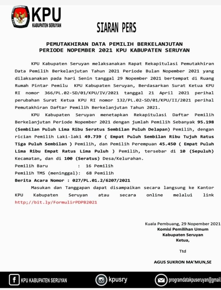 Pengumuman Pemutakhiran Daftar Pemilih Berkelanjutan Kabupaten Seruyan Periode November 2021