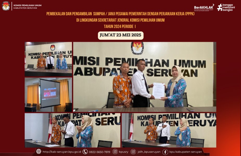 Kuala Pembuang –Komisi Pemilihan Umum (KPU) Kabupaten Seruyan pada Jumat, 23 Mei 2025 melaksanakan kegiatan Pembekalan dan Pengambilan Sumpah/Janji Pegawai Pemerintah dengan Perjanjian Kerja (PPPK) Tahun 2024 Periode I secara serentak bersama seluruh KPU di Indonesia. Kegiatan ini berlangsung di Kantor KPU Kabupaten Seruyan dan diselenggarakan secara daring oleh Sekretariat Jenderal KPU Republik Indonesia sesuai dengan Surat Sekretaris Jenderal KPU RI Nomor 626/SDM.02-Und/04/2025 tanggal 22 Mei 2025.